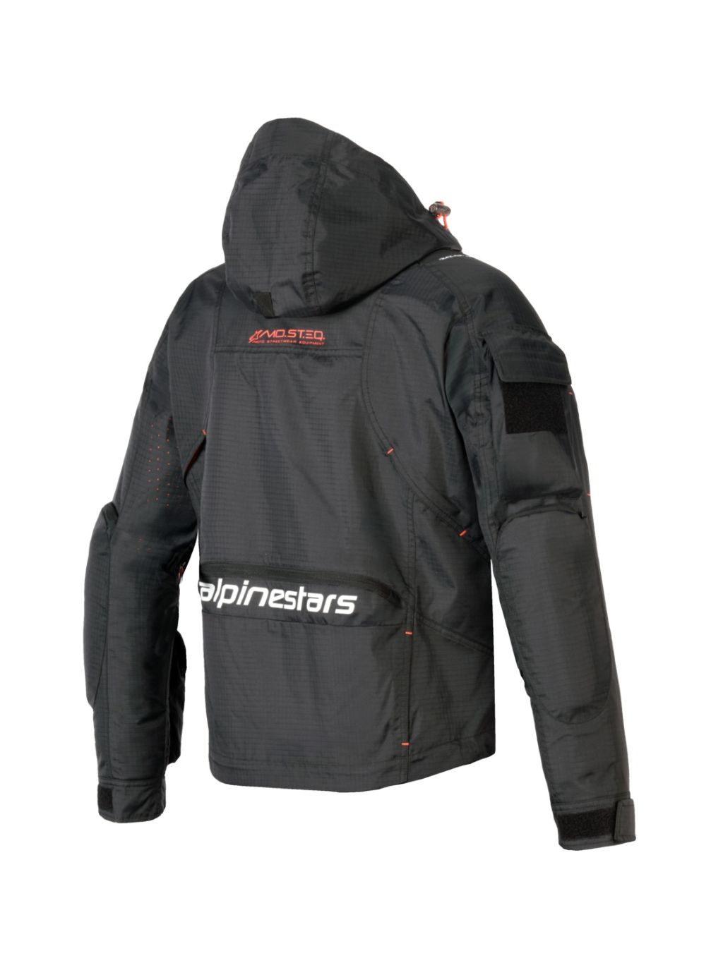 • Lehká, nastavitelná a skladná kapuce posytuje ochranu před občasným, nečekaným deštěm zatímco patent pro její fixaci zabraňuje jejímu pohybu během jízdy na motocyklu. Pro zvýšení všestrannosti je možné kapuci sbalit a skrýt do zakladače v úrovni límce.