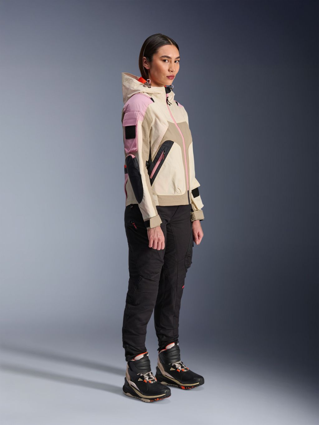 Lehká, nastavitelná a skladná kapuce posytuje ochranu před občasným, nečekaným deštěm zatímco patent pro její fixaci zabraňuje jejímu pohybu během jízdy na motocyklu. Pro zvýšení všestrannosti je možné kapuci sbalit a skrýt do zakladače v úrovni límce.