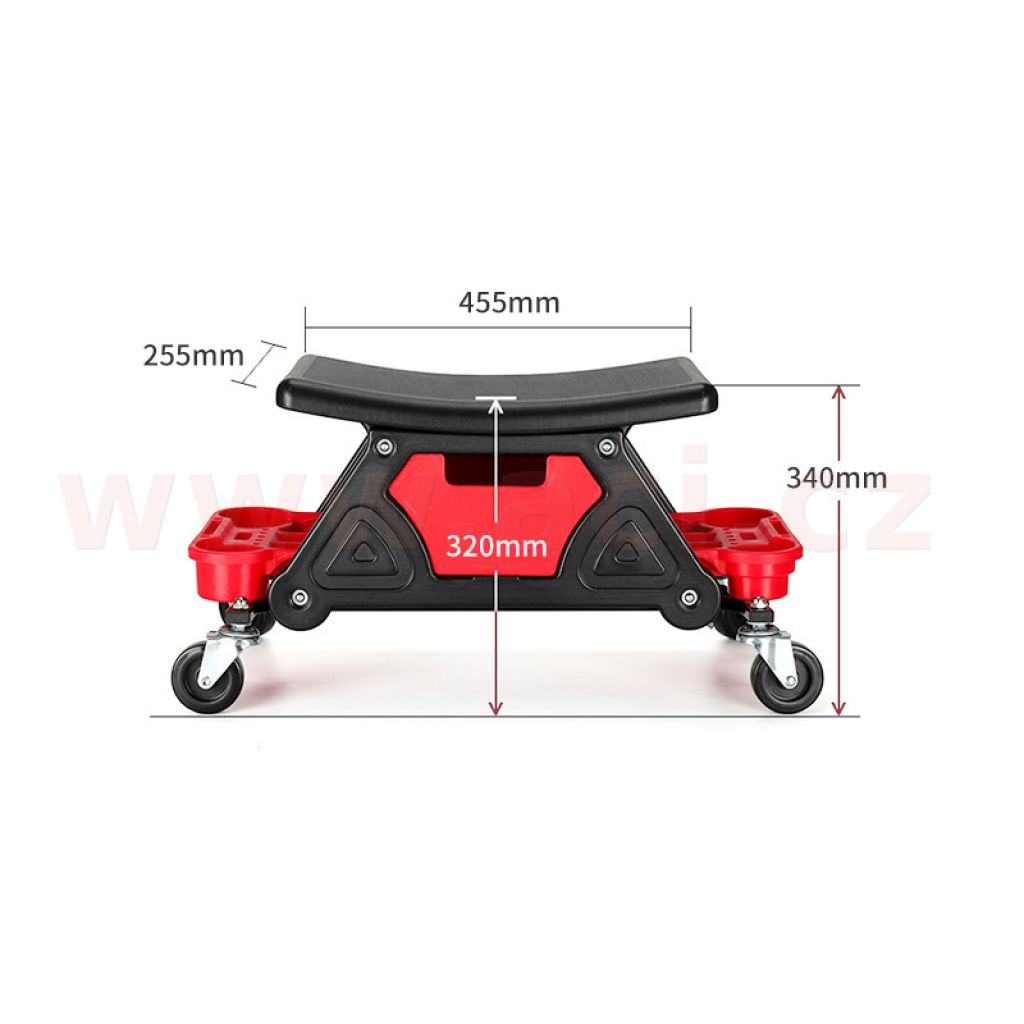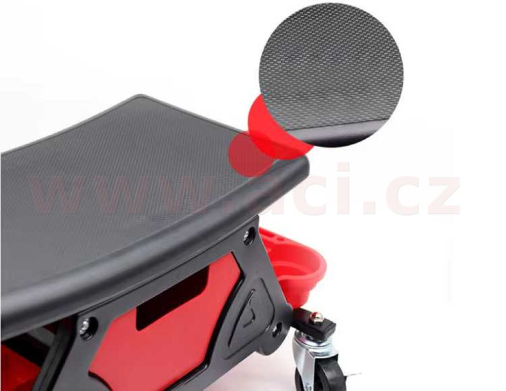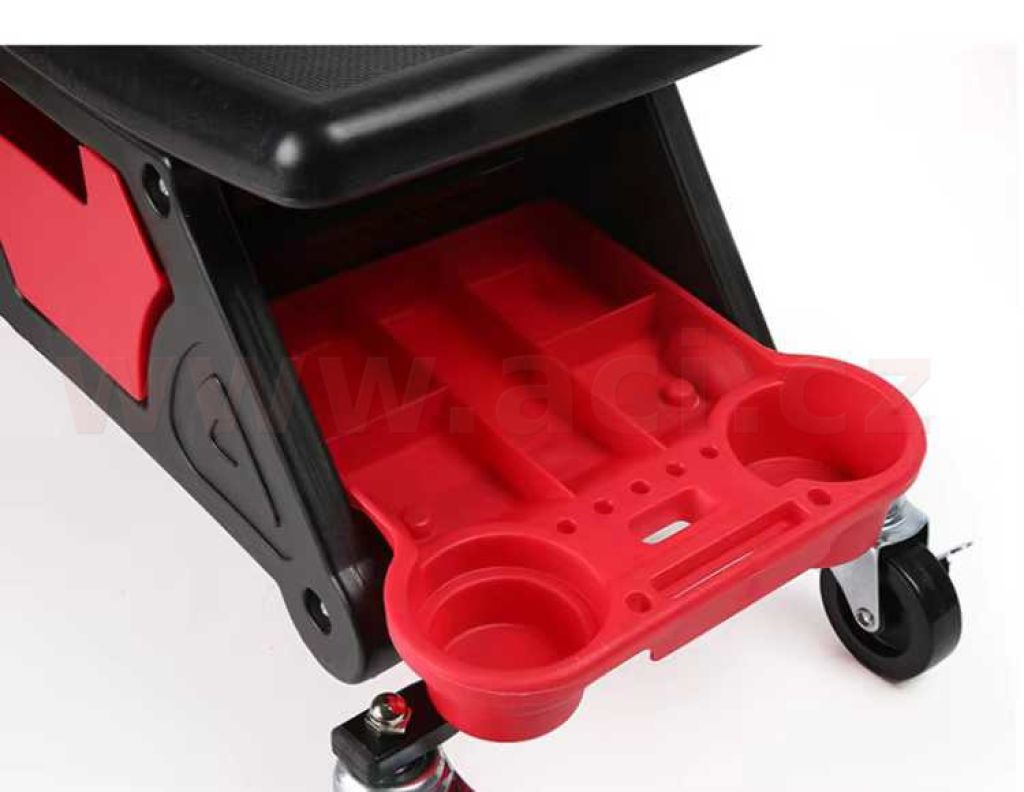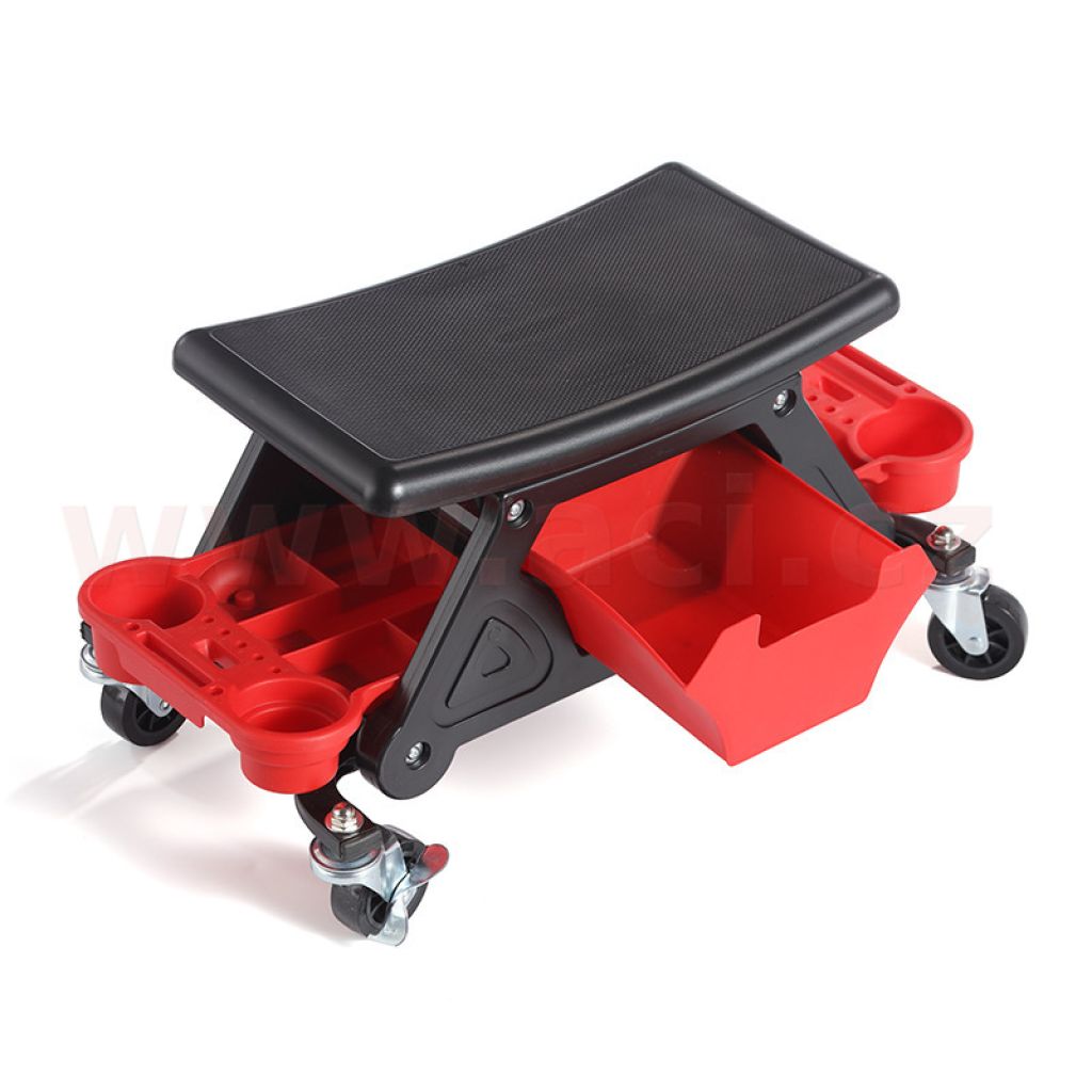 Pojízdná dílenská stoličk pro detailery, mechaniky a domácí kutily. Je vybavena výsuvnou zásuvkou, bočními organizéry a čtyřmi otočnými kolečky 360°, které umožňují pohodlný pohyb kolem vozidla a udržení potřebných příslušenství vždy po ruce. Robustní konstrukce zajišťuje komfort při práci a stabilitu i během dlouhodobých servisních činností.