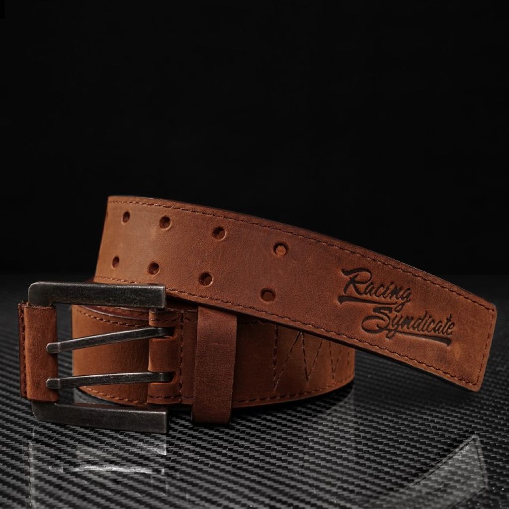 Kožený opasok s kovovou sponou v úprave Gun Metal, a vypaľovaným logom Racing Syndicate.