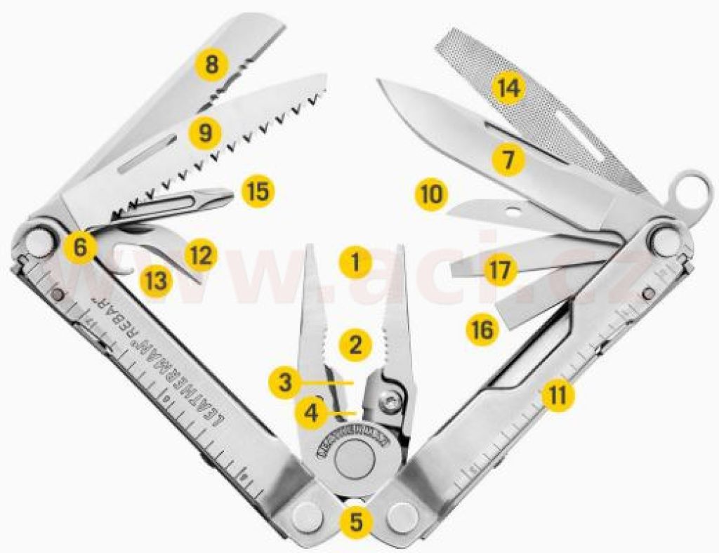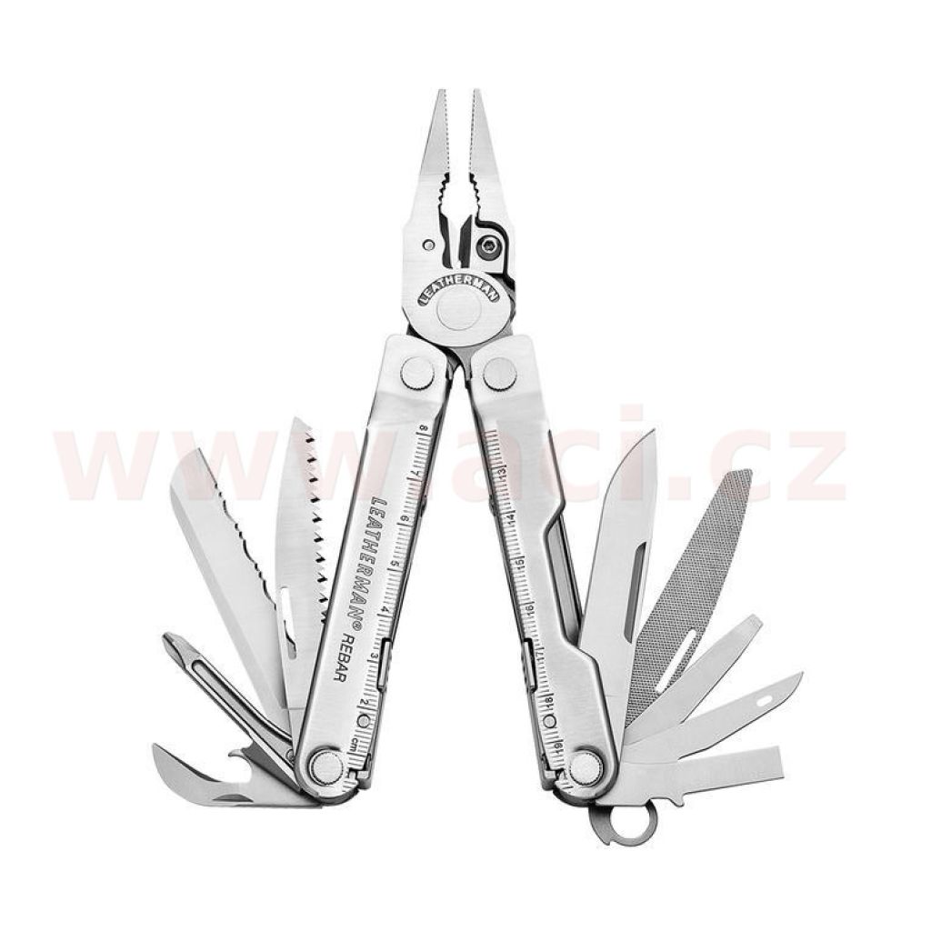 Design multitoolu REBAR odkazuje na tradici značky Leatherman. Základem jsou štíhlé, zato velmi silné multifunkční kleště s vyměnitelnými břity štípaček. Univerzální výbava obsahuje všechny důležité základní nástroje a uspokojí všechny: od domácích kutilů, přes profi montéry až po výletníky a turisty. Každý ze sedmnácti funkčních nástrojů je vybaven pojistkou proti nechtěnému sklopení. Krom tradičních kombinovaných kleští obsahuje multitool Leatherman REBAR dva nože s rovným a zubatým ostřím z nerezové oceli 420HC, pilku, šídlo, sadu otvíráků na konzervy i na láhve, pilníky na kov i na dřevo a sadu šroubováků. Ve 190 gramech oceli si zkrátka každý najde to své.
