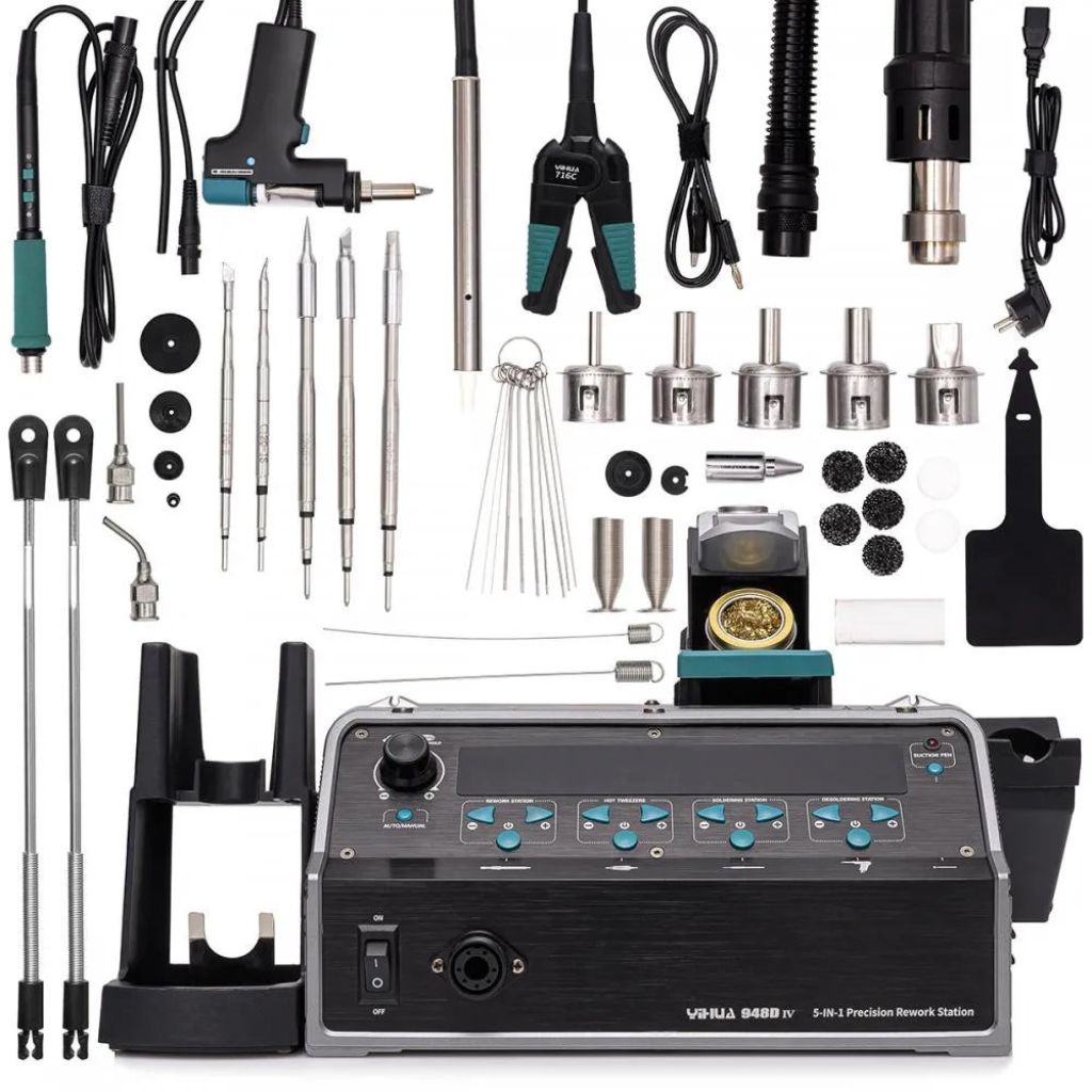 Yihua 948D-IV je profesionální integrovaná pájecí stanice servisní třídy, která kombinuje pět špičkových nástrojů v jednom kompaktním zařízení. Zapomeňte na zamotané kabely a několik samostatných přístrojů – tato stanice spojuje horkovzdušnou pájku, páječku, odpáječku, termopinzetu a vakuový uchopovač v jediném pouzdře.