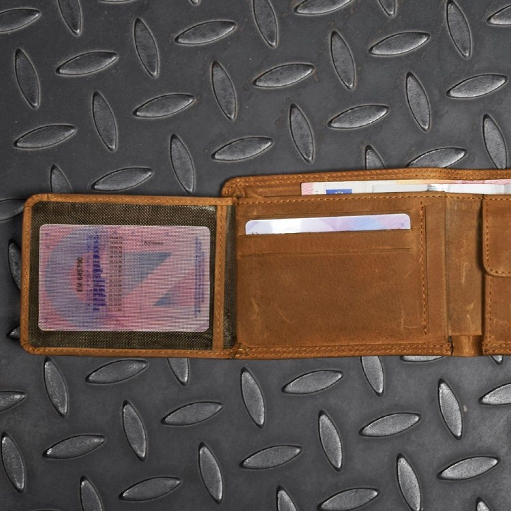 Hnedá kožená peňaženka od 4SR so závodným erbom šachovnicovej vlajky.