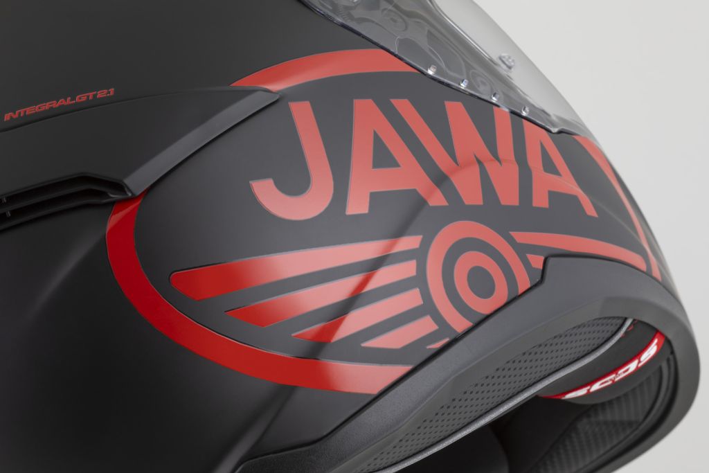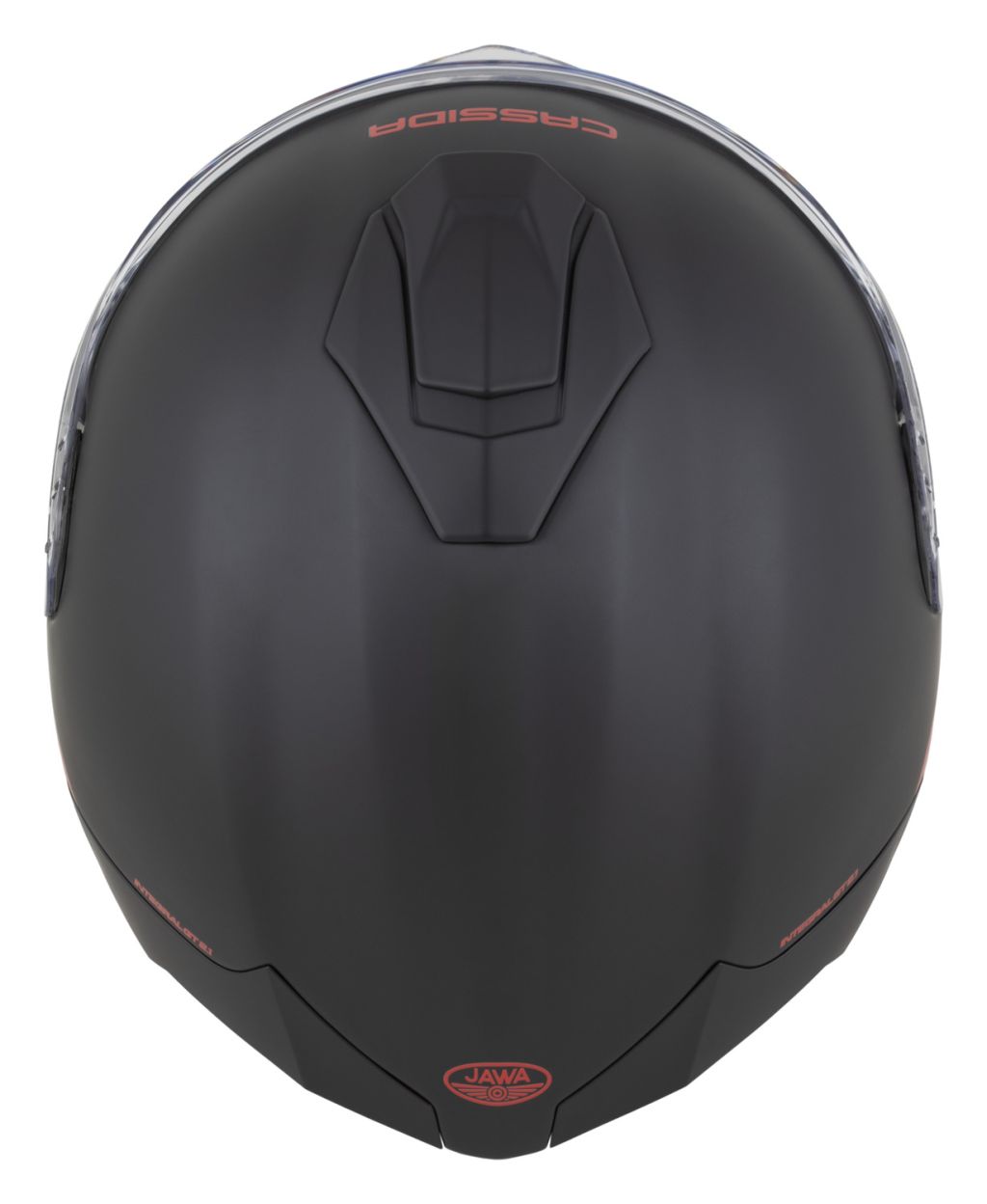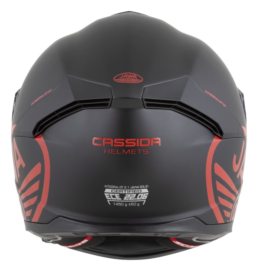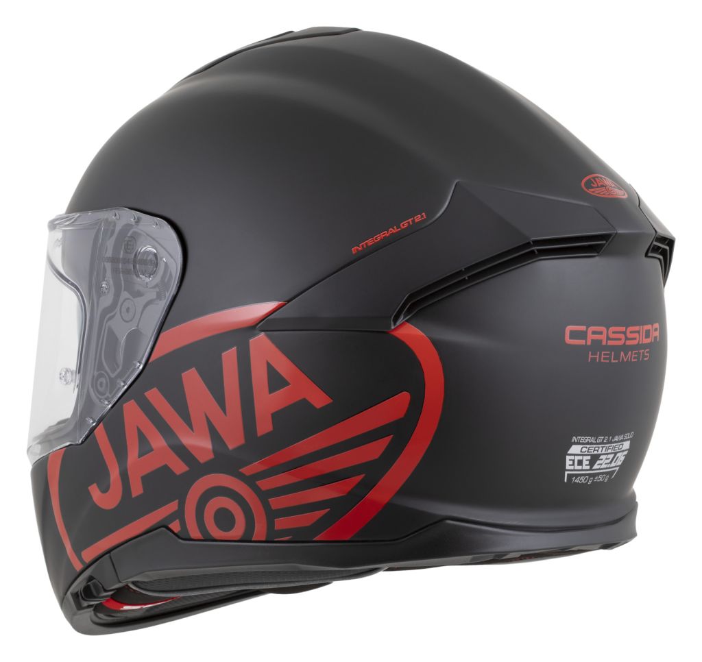 Grafika CASSIDA INTEGRAL GT 2.1 JAWA SOLID ve spolupráci s výrobcem motocyklů JAWA. Provedení v černém mat povrchu s polepy v červeném lesku.