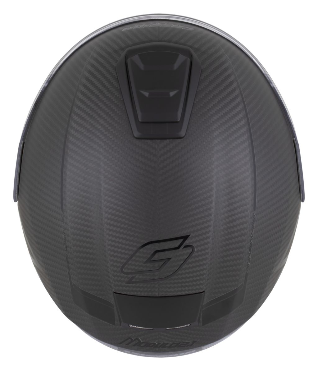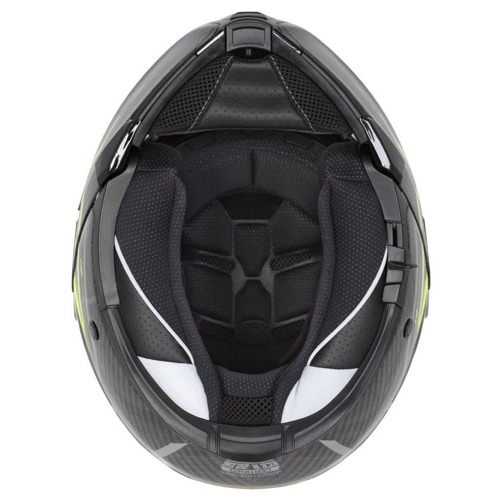Lehká karbonová skořepina, příprava pro sluchátka s kabeláží komunikátorů a komfortní interier s částečným límcem obepínajícím hlavu ve spodních partiích, který disponuje velkým množstvím reflexních prvků.