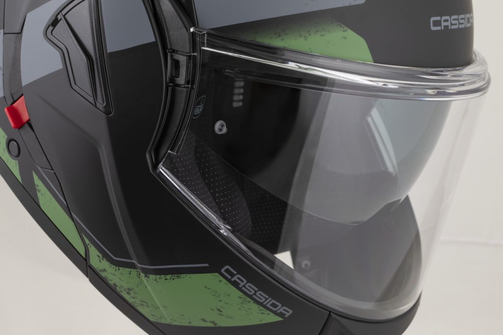 • Dvojí homologace ECE 22.06.P/J pro otevřenou a integrální přilbu s možností fixace výklopné části ve vyklopené poloze pomocí pojistky.