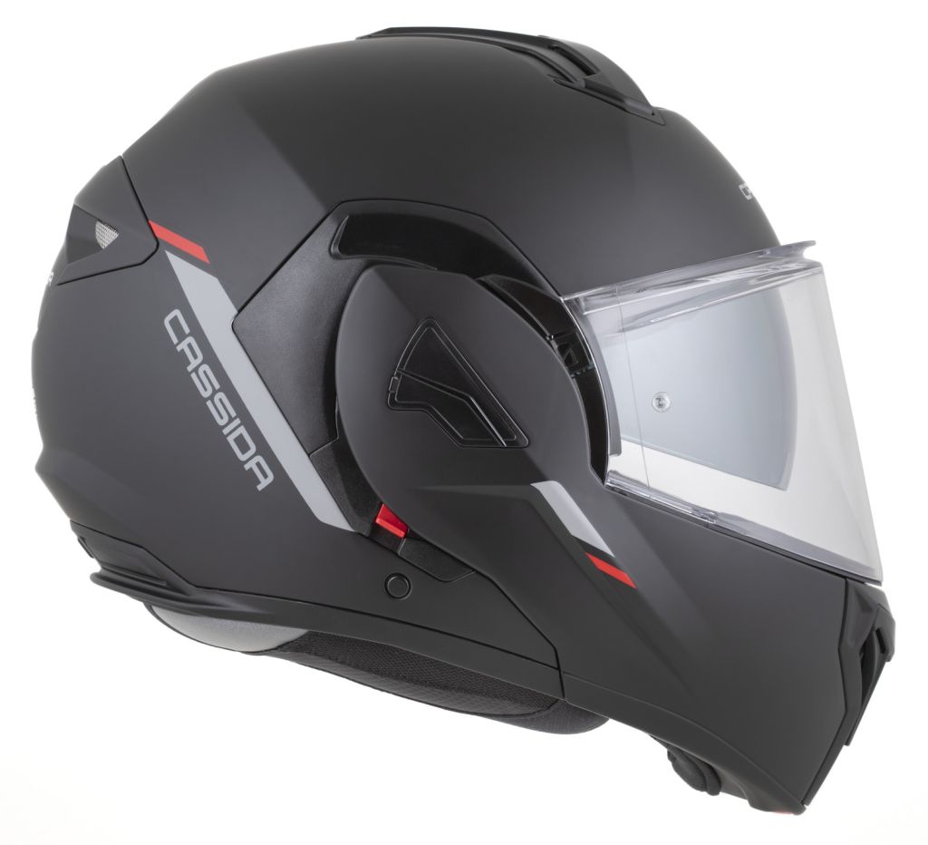 • Dvojí homologace ECE 22.06.P/J pro otevřenou a integrální přilbu s možností fixace výklopné části ve vyklopené poloze pomocí pojistky.