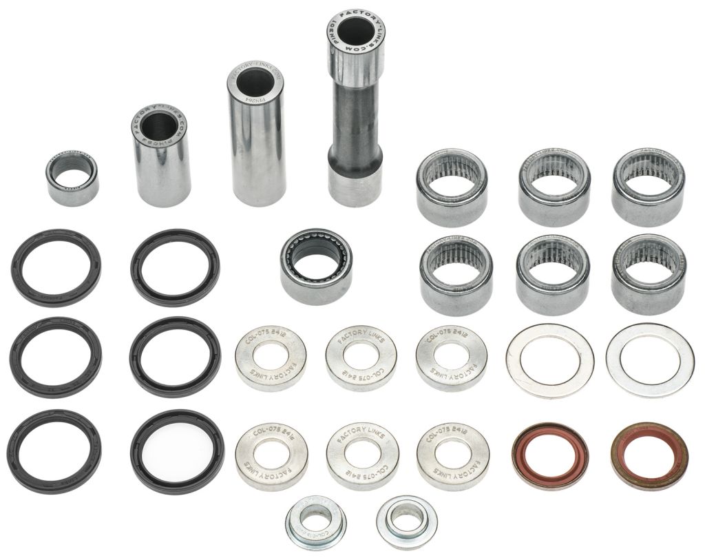 - Sady Factory Links vždy obsahují konkrétní komponenty (čepy, ložiska, pouzdra, příložky, podložky, rozpěrky, simeringy, kloubová ložiska, jehlová ložiska) pro konkrétní motocykly (detaily v zařazení).