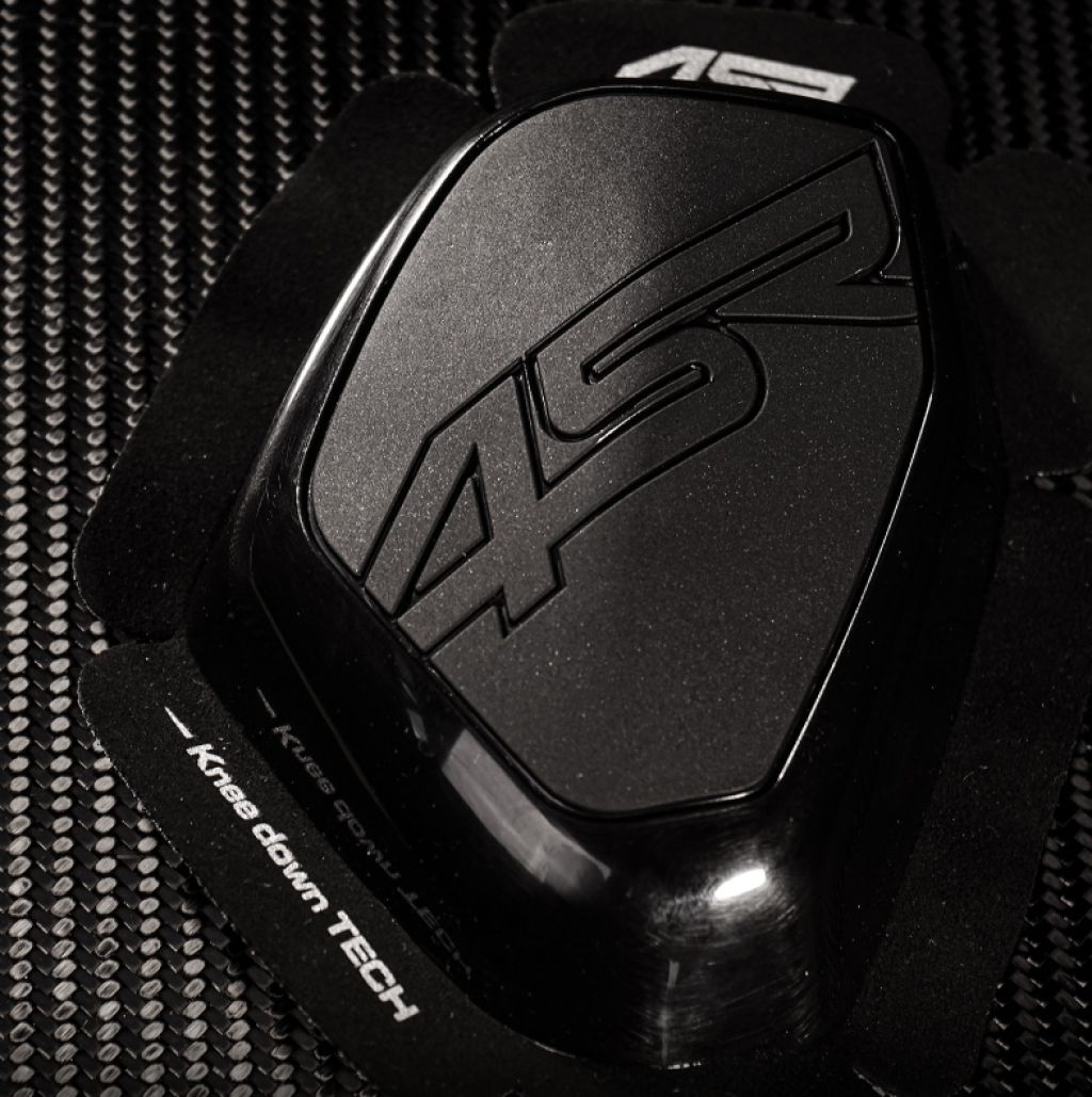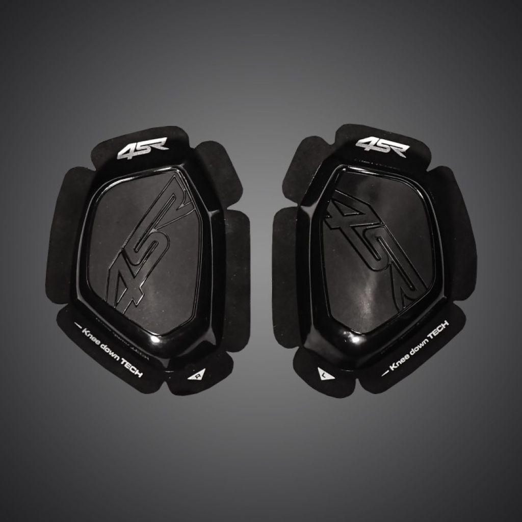 Čierne kolenné slidery z odolného plastu, nevyhnutný doplnok pre milovníkov extrémnych náklonov.